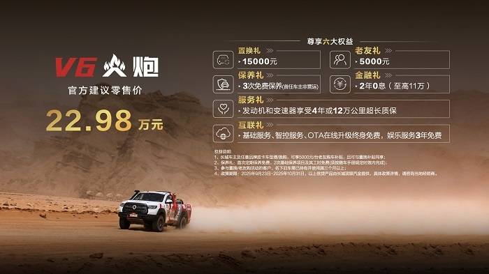 此次V6火炮上市交付,长城炮还为用户推出特别权益:凡驾驶V6火炮参加由政府举办的100台赛车以上规模赛事,将给予冠亚季军3000-10000元赛事补贴;针对购车一年以内的火炮首任车主,因越野、玩沙场景需更换易损件,工时免费,部分配件免费或五折优惠。