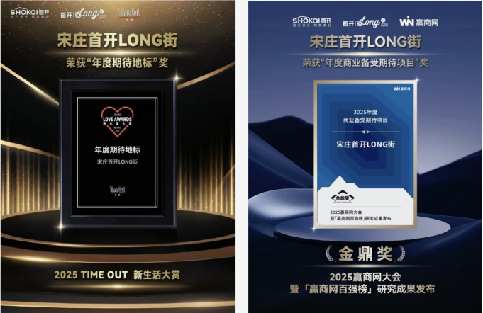 值得一提的是,宋庄首开 LONG 街先后斩获Time Out北京“2025新生活大赏”的“年度期待地标奖”与赢商网“2025中国零售商业地产金鼎奖”之“商业备受期待项目”奖。两大权威奖项的背书,既是业内对其创新模式的高度认可,更彰显了行业与市场对项目未来价值的坚定信心。
